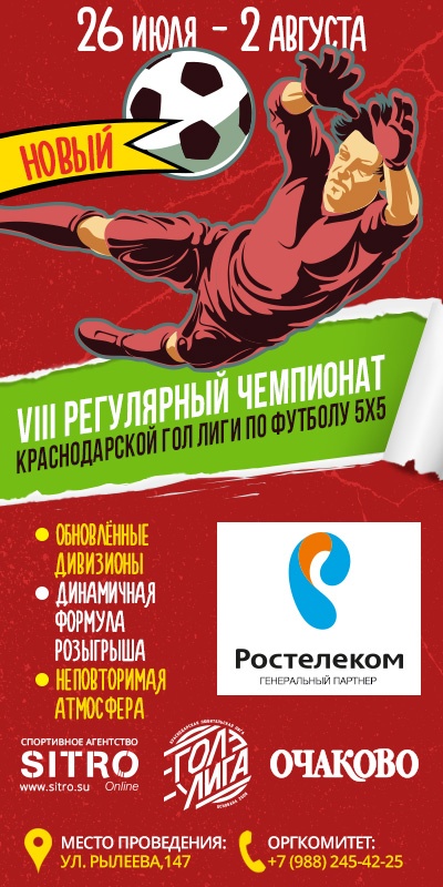 26 июля в Краснодаре стартует самый «старейший» турнир среди дворовых команд по футболу 5х5 — VIII Регулярный Чемпионат Краснодарской Гол лиги. Эти соревнования отличаются от других мини-футбольных «сходок» качественной организацией, количеством возрастных дивизионов и призовым фондом.Уникальной особенностью соревнований от других российских любительских турниров является формат мероприятия: все матчи неизменно проводятся под музыку и комментирование. Этот турнир не станет исключением, организаторы разработали новый регламент, розыгрыш престижного трофея пройдёт по более динамичной формуле, с учётом рейтинга команд.