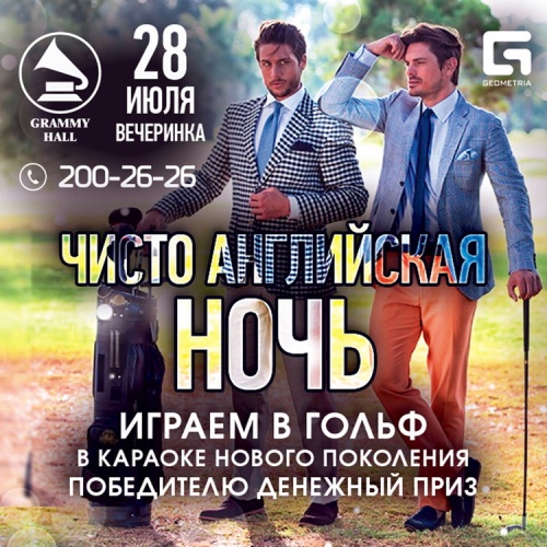 Клуб «Платинум» и караоке «Грэмими-холл» приглашают на вечеринку «Чисто английская ночь».В программе — «игра в гольф в караоке нового поколения». Победитель получит денежный приз.