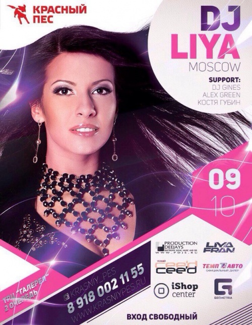 В гастропабе «Красный пес» — вечеринка с участием диджея LIYA — одной из самых востребованных девушек-диджеев в Москве, а так же резидентом лучших заведений столицы PPL, CHIPS Club, SOLUXE Club, BUDDHA BAR MOSCOW и постоянным гостем многих других заведений. Так же официальный DJ зимних олимпийских игр Сочи 2014.Справки по телефону 8918-002-11-55.