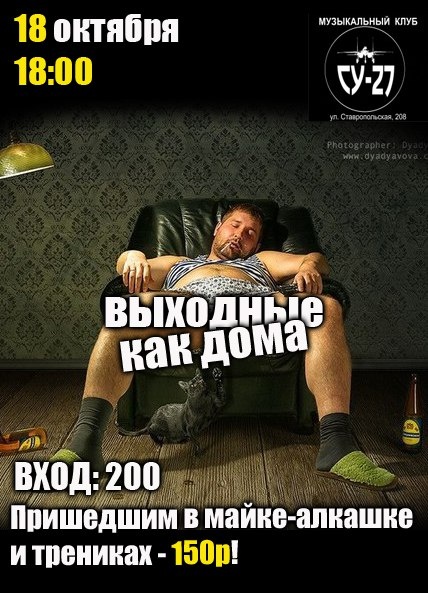 Су-27 приглашает на вечер со спокойной домашней обстановкой.- Дресс-код для парней, пришедших в что-то типа: спортивные штаны с вытянутыми коленями, майки-алкашки «аля 80-е», и прочая атрибутика — вход 150р.