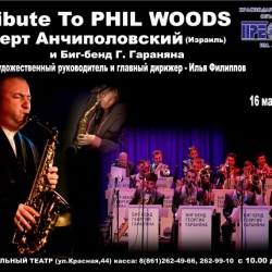 Роберт Анчиполовский (Израиль) и Биг-бенд Г. Гараняна 16 марта представят премьеру проекта Tribute to Phil Woods («Посвящение Филу Вудсу»).Всемирно известный американский джазовый музыкант и композитор Фил Вудс признан в современном джазе одной из звезд первой величины. Принадлежит к лидерам мэйнстрима и сервайвл-движения, ориентирующегося на сохранение и развитие классических достижений свинга бибопа, хард-бопа и кул-джаза.