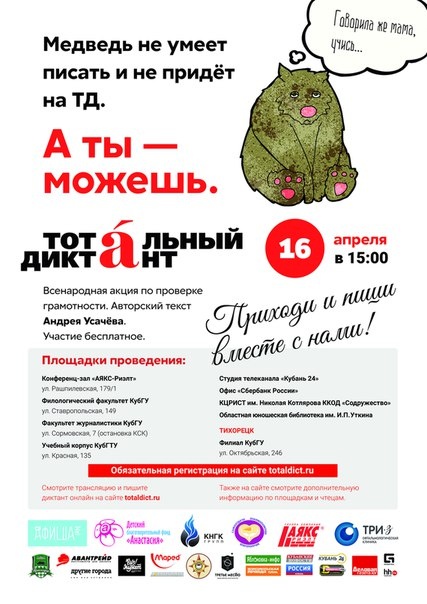 В Краснодаре 16 апреля в 15:00 состоится очередная акция «Тотальный диктант».В этом году вы можете проверить свою грамотность в четырёх местах: