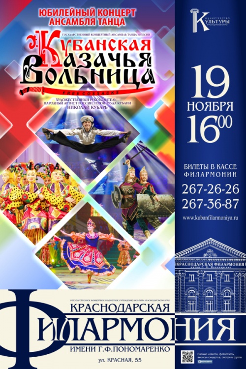 Государственный концертный ансамбль танца и песни «Кубанская казачья вольница». В программе лучшие танцы коллектива.Телефон кассы: 267-26-26, 267-36-87