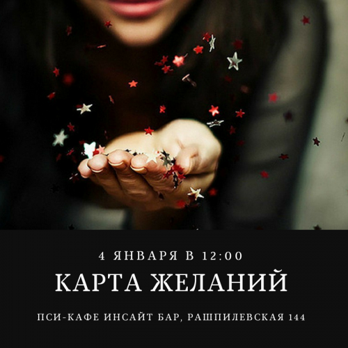 На мастер-классе Вы сможете не только составить свою Карту желаний, но и с помощью ведущего психолога понять свои истинные цели. В жизни появятся нужные люди и полезные ситуации.