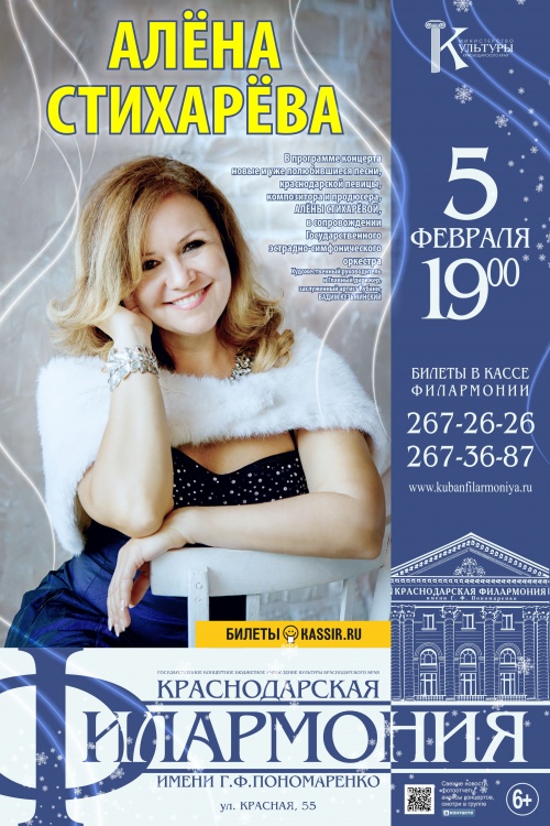 Поет Алёна Стихарёва в сопровождении Государственного эстрадного оркестра.Алёна Стихарёва — одна из самых ярких творческих личностей Краснодара. Она не перестаёт удивлять краснодарских зрителей. Певица, композитор, поэт, сценарист, продюсер.
