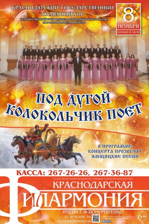 Краснодарский государственный камерный хор. В программе концерта прозвучат ямщицкие песни.Билеты для льготных категорий лиц продаются со скидкой 50%