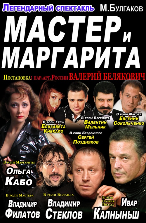 Мастер — Владимир Филатов, Маргарита — Вера Сотникова, Воланд — Владимир Стеклов, Пилат — Иварс Калныньш, Бездомный — Андрей Бута, Коровьев — Виктор Маруженко, Бегемот — Валентин Мельник, Берлиоз — Виталий Крапива