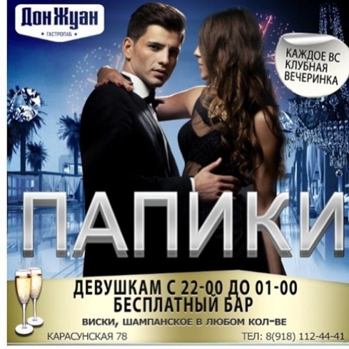 Для девушек действует специальное предложение в баре «Дом Жуана» — бесплатный бар с 22:00 и до 01:00. Гостям предложат благородный виски и пьянящее шампанское без ограничений.В воскресенье бар работает с 18:00 и до 6 утра.