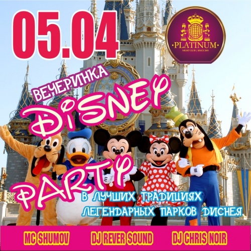 Вечеринка в стиле героев Walt Disney пройдет в ночном клубе Platinum.В программе: любимые герои мультфильмов, ростовая анимация, мульт вижн шоу.