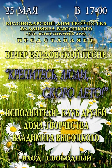 25 мая в 17 часов ждем всех на вечер бардовской песни «Крепитесь, люди, скоро лето!»Участники — Клуб Друзей Дома творчества Высоцкого.