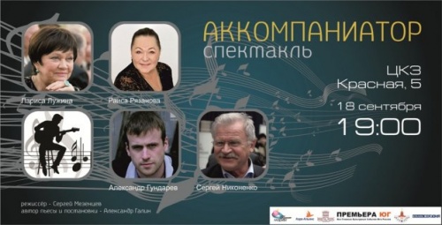 18 сентября местные театралы получат возможность и удовольствие воочию лицезреть лучших артистов страны. Народные артисты Лариса Лужина, Раиса Рязанова, Сергей Никоненко и молодой, но невозможно обаятельный Александр Гундарев (знакомый многим по сериалу «Глухарь») расскажут весело-печальную историю о старости, одиночестве и надежде в спектакле «Аккомпаниатор».«Аккомпаниатор» — это история любви, судьбы, радости прощения, история нашей жизни. И речь здесь вовсе не о музыке, хотя и она звучит со сцены, а о молодом музыканте Григории. Он, подталкиваемый, как водится, молодой и не очень щепетильной женой, находит способ заработка — начинает ухаживать за пожилыми, одинокими и обеспеченными людьми. Естественно, не просто так, а в надежде на какие-то дивиденды в будущем. И все бы, наверное, у него получилось, не встреться на его пути…