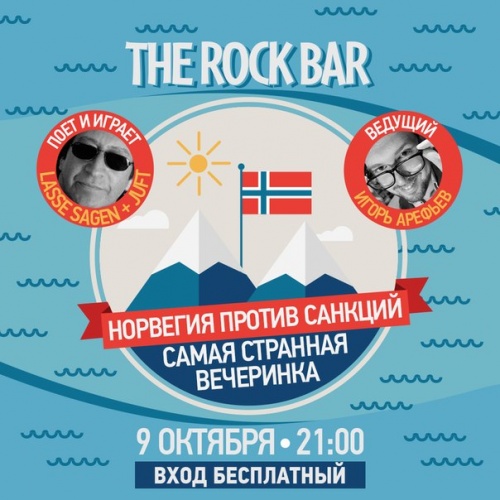 Вечеринка в норвежском стиле пройдет в The Rock Bar на Горького. Сообщается, что происходящее будет связано с западными санкциями, норвежской промышленностью, группой Juft и Лассе Сагеном.Это все может показаться чем угодно, только не нормальным! В норвежское безумие входит кошмарно старые норвежцы из 70х – Juft, а также под минус бабахнет Lasse Sagen. На входе вас встречают водочка и канапе с норвежским лососем. Весь этот скандинасвкий бутерброд плюс ведущий Игорь Арефьев, ну и конечно же санкции, санкции, санкции...).