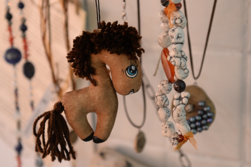 По периметру выставочного пространства расположилось около 15 столов (и столько же участников) с товарами народного и художественного промысла: бусы, сережки из полимерной глины, галстуки-бабочки, мягкие игрушки, магнитики и картины «зиповцев».