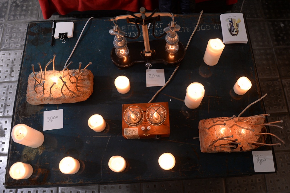 Начинающий стилист Любовь Фартушная в образе средневековой дамы торгует хэнд-мэйд ассортиментом, Константин Ре и Анастасия Зуева продают свои акварели (от тысячи до пяти тысяч рублей) и светильники ручной работы (намного дороже).