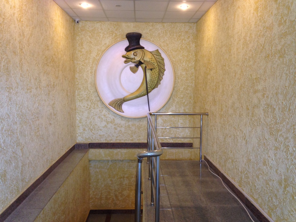 Широкие красные двери, помимо вывески с названием, украшает фигура задорного прямостоящего карпа (надеюсь, что мы правильно определили «породу» рыбы) в шляпе и с тростью. Когда мы подошли, из дверей вышли люди в форме казаков. Внутри – спуск в подвал, над лестницей – еще более устрашающий карп, указующий путь к еде. Спускаемся вниз.