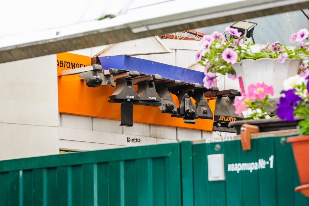 Магазин с багажниками оказался частным домом, да еще и рекламным агентством по совместительству. Лишь по торчащим из-за забора образцам креплений мы с фотографом поняли, что пришли по адресу. Оказалось, что на месте можно выбрать и купить только рейлинги и поперечины — сами багажники нужно выбрать по каталогу или на сайте и забрать товар из магазина через 1-2 дня.